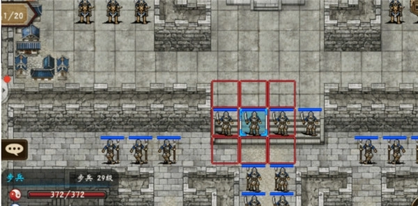 图中蓝框平行位置即为城楼安全区域,需要特别注意的是我方典韦刘备在我方回合结束时不可在面前防区留下空档,以防陈宫过来焰冲直接烧死我方后排法师,此时简雍极限距离用清心解毒加血,曹操待命给己方回蓝,徐庶由于手长可和荀彧用技能支援中间或者清理俩边冲过来的枪兵(没把握就别出安全区,免得被枪兵刺死)。