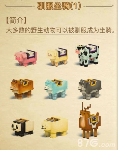 大多数的野生动物都可以被驯服成为坐骑,但是这类坐骑一般都比较低级,像是猪、熊猫、奶牛都是比较常见的普通坐骑。