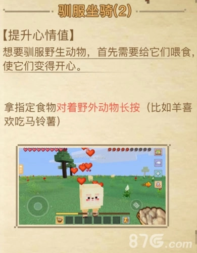 喂完食物,野生动物变得开心后,头上就会冒出一颗颗红色的爱心,这时候我们就能将其驯服为坐骑了。