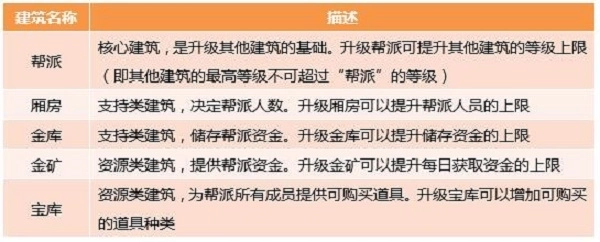 帮派建筑有五种,分别为“帮派”、“厢房”、“金库”、“金矿”、“宝库”: