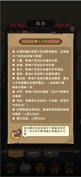 1、首先打开游戏主界面【角色】板块,点击【角色】界面右上角问号按钮可详细查看大圣的各项能力数据。