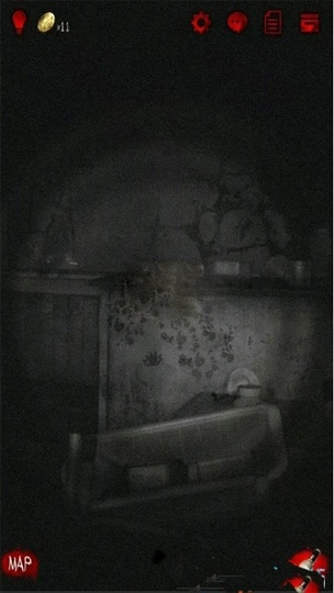 12、然后,点击旁边的窗帘,点两次,就会被拉开,里面是破旧的浴缸,里面流淌着鲜血。