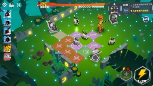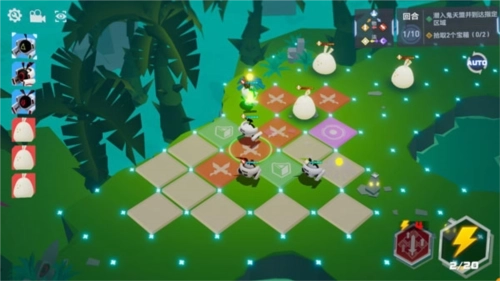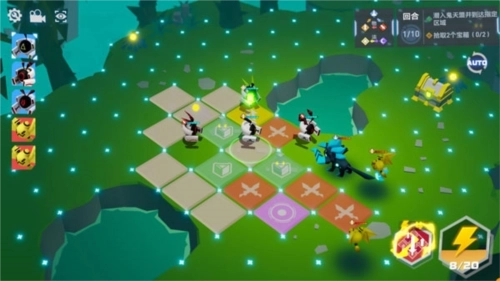 进入战斗模式后,左上角会显示参赛者和敌人的行动顺序,右下角是元力值和技能,右上角是关卡目标和剩余的战斗回合数。而整个战场会被分成若干个小地格,天使们需要指挥参赛者在这些地格间移动,排兵布阵,并在限定的回合内击败所有的敌人。