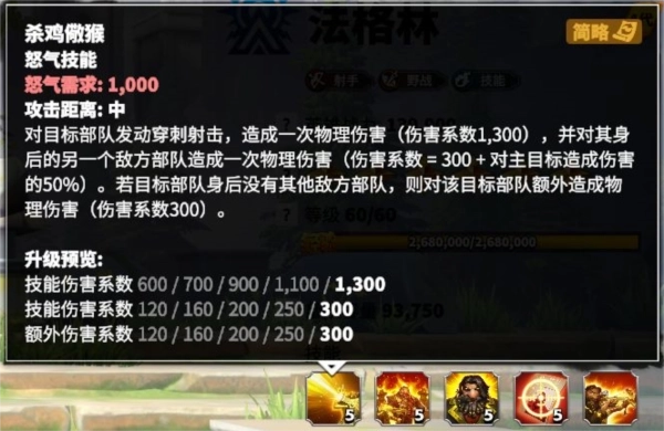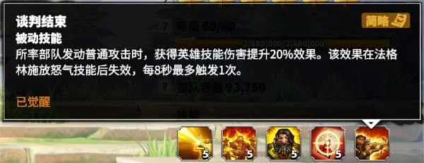所率部队发动普通攻击后获得英雄技能提升伤害效果,在法格林释放怒气技能后失效;每八秒最多触发一次英雄技能伤害提升效果。技能效果不错,经过实测,本技能在实战的运行逻辑为:进入战斗—法格林平A—获得增益—8秒后本技能冷却—法格林放技能,失去增益—法格林平A—获得增益—副将放技能;因此实战中基本可以保持本技能对主将和副将的全程覆盖,因此无需太过于纠结把法格林用于主将还是副将。