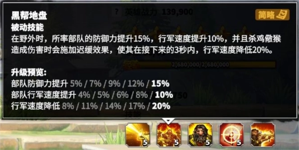 增加所率部队的防御力和行军速度,主动技能造成伤害时还会施加减速效果。偏向防御和增加部队拉扯能力的技能,效果不错但对输出影响不大,可以不优先升级。