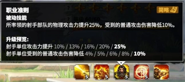 增加率领射手部队的物理攻击力,减少收到的普通攻击伤害。常见的输出增益技能,同时还可以增加一定的生存能力,整体效果优秀。