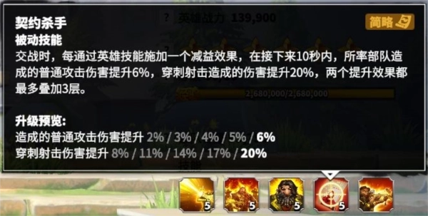 交战时,每通过英雄技能施加一个减益效果,接下来一定时间内普通攻击和穿刺射击(法格林的主动技能)造成的伤害提高,两种效果最多可以叠加三层。数值提升非常明显,满级技能叠满后可以增加18%普通攻击伤害和60%穿刺射击伤害,可以大幅度提升部队输出能力;技能的主要特点在于,除了自己的二技能外还需要配合其他技能才能尽量提高覆盖率;而具体的搭配详见下文的“英雄搭配”部分。