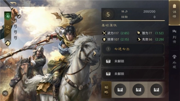 自带战法:【七进七出】,属于被动战法,凭借“规避”这一特性,赵云在任何伤害面前都能从容应对,而成功触发“规避”后所激活的“龙胆”,则可对敌人频繁造成伤害。