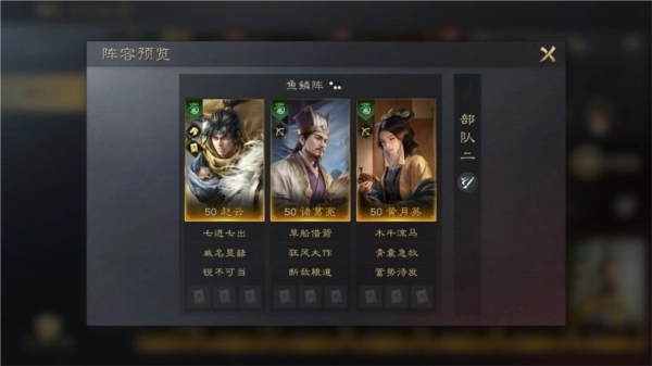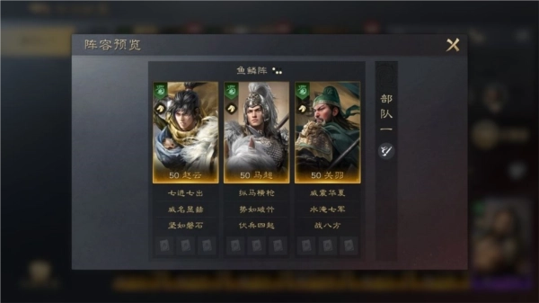 这套阵容可以触发“五虎上将”的缘分效果,提升部队武将的会心概率,搭配鱼鳞阵能进一步增强爆发力。赵云的【坚如磐石】可“嘲讽”敌军,为【七进七出】的多次触发创造条件;关羽的【水淹七军】与【战八方】能对敌军全体施加异常状态,助力马超的【纵马横枪】打出更可观的爆发伤害。