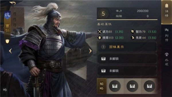 曹仁凭借高额的统率成长值,奠定了其作为防御型武将的坚实坦度基础。他的自带战法颇具特色,一方面能为自身提供减伤效果,有效保障生存能力;另一方面还可对敌军施加“技穷”状态,使对方无法发动主动战法。