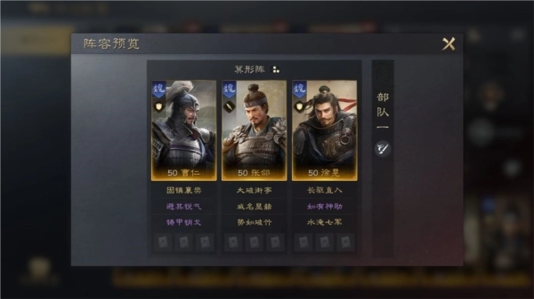 曹仁凭借自身兼顾承伤与控制的能力,保障了部队的整体生存;夏侯渊与许褚作为高爆发型武将,可在短时间内迅速击溃敌军,助力实现低战损取胜的目标。