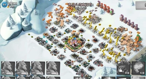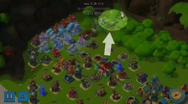 3、聚集之后扔出3震一机器小怪,释放英雄技能远程遥控震爆火箭炮(先用火炮炸残血,残血的建筑会成为部队、以及远程遥控优先选择的目标),很快就拆掉了本后的防御建筑。