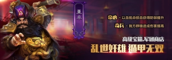 董卓在游戏中使剑锤双持攻击,辅以冲撞、砸击组成标准的力量型主将战斗风格。攻击距离较短、移动速度略慢,但攻击范围及伤害很好低弥补了这一点。董卓的庞大的身躯让他的移动速度略慢,可是也让的每一次攻击都极具杀伤力,大锤砸在地上的深坑也让人触目惊心,但是高防御高伤害也受到不少玩家的喜爱。