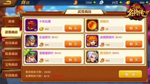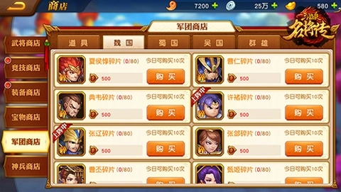 武将商店可以购买各阵营紫色以上品质武将碎片和完整武将卡片。