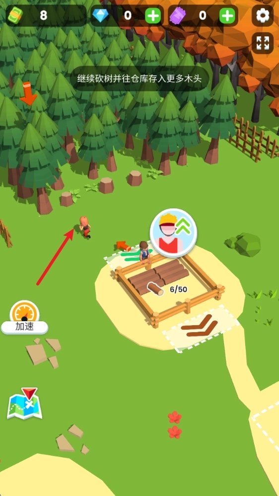 2、砍伐好的树木可以运送到自己的仓库中,随后我们根据提示招募工人帮助我们一起砍伐树木。
