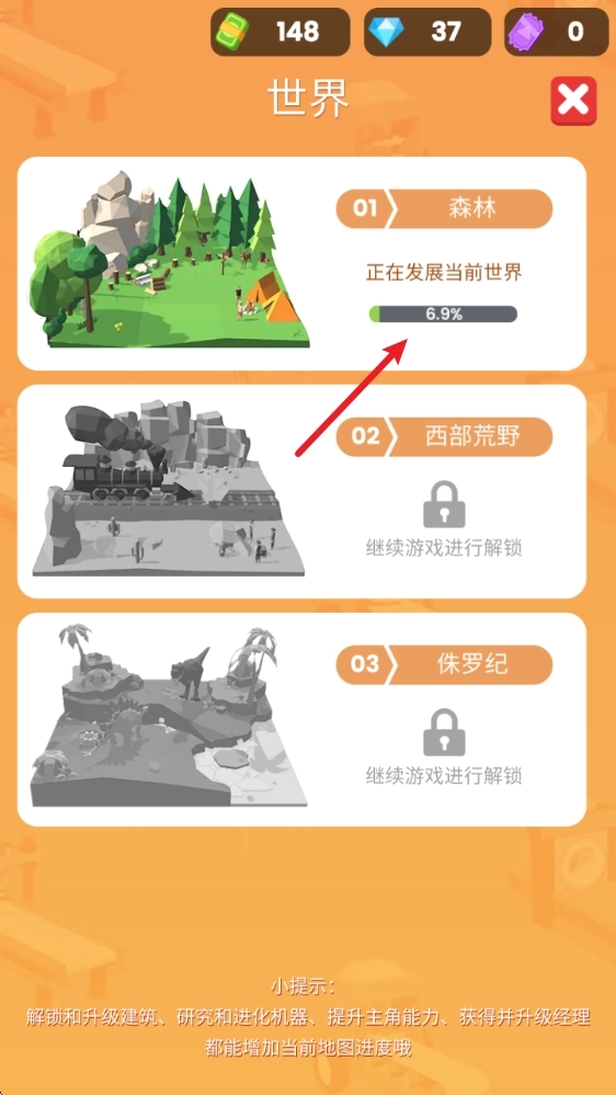 3、当上一个世界的进度满了之后,我们就能够解锁新的区域了。