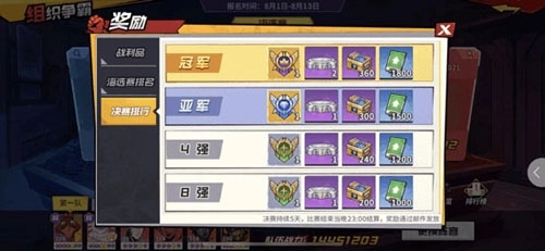 奖励分为个人奖励与组织奖励两类。组织奖励方面,海选赛阶段可获取卓越增幅碎片以及专属道具碎片箱(内含疫苗人和背心尊者的超绝道具碎片);决赛阶段的奖励则以徽章和典藏底座为主。个人奖励需由玩家在每日22:00之后自行领取,该奖励不会通过邮箱发送,主要包含精致底座等物品。需要注意的是,若个人物资累计达到200,可额外开启一次奖励;个人物资通过每次进攻获取,胜利时可得40物资,失败时可得20物资。