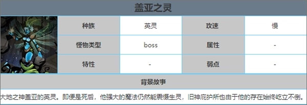 --1.第一形态:盖亚之灵会掏出一个白色小球砸向玩家,造成高额伤害,但间隔时间较长,只要盯好血限适当释放技能和恢复药,就不会有很大的威胁。