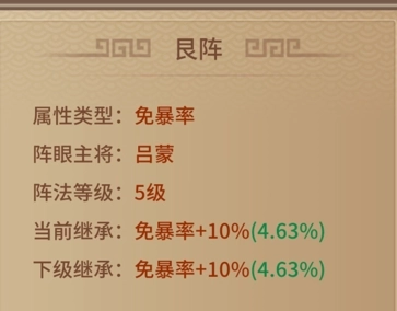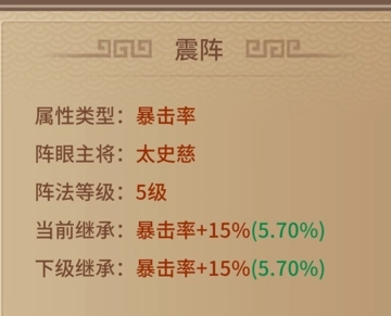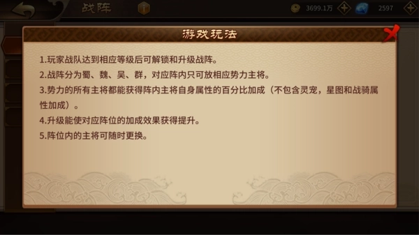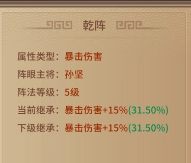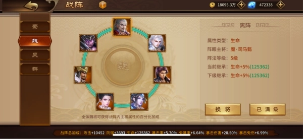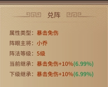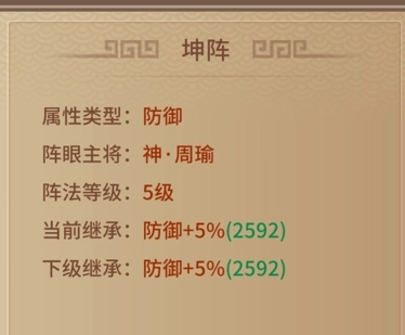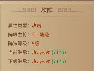 战阵里的四大家族(蜀、魏、吴、群)由七卦阵环环相扣、阴阳结合构成,这七卦阵分别是离阵、坤阵、兑阵、乾阵、坎阵、艮阵、震阵;每个阵眼都有5个等级,当阵法达到对应的等级时即可解锁。