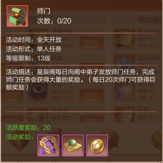 忙碌的做完师门任务之后,可以选择参加龙渊初考,周一至周五的每天中午12点至24点,都可在在活动界面进入龙渊初考参加答题活动,每次答题都会提供大量的经验。