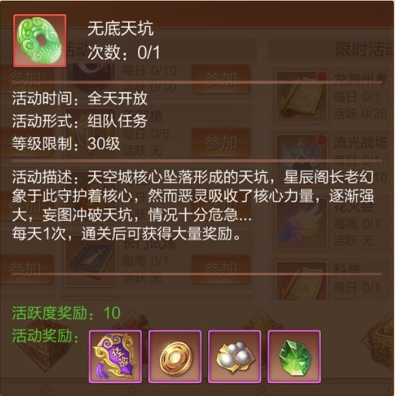 当等级达到30级以后,相信各位也在游戏内结识了不少小伙伴了,这时候就可以约好时间,参加全天开放的“无底天坑”(不要被名字吓倒,风景坑里独好),不仅可以获得大量经验,还有其他各种给力道具。