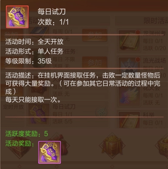 这里有个小细节需要注意以下,挂机界面的右下角,有一个小试牛刀的选项,请在挂机之前务必接取此任务。每天击杀一定数量的怪物,即可获得大量的奖励。