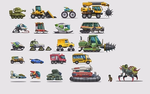 我们为游戏设计了21种造型各异的载具。每种载具都具有独特的属性和行进方式。不同的属性与上文提到的不同游戏场景中的地面相互适配。这一点是玩家在玩游戏时需要注意的。所有的21种载具被划归到由强到弱的C,B,A,S四个不同的级别中,相应级别的车辆只能在其对应级别的站点车库内才能被解锁,但是解锁后,全场各级站点车库皆是可用状态。