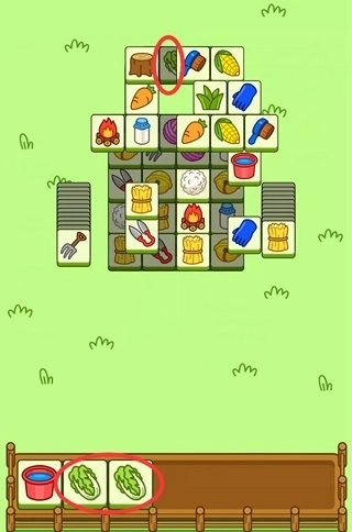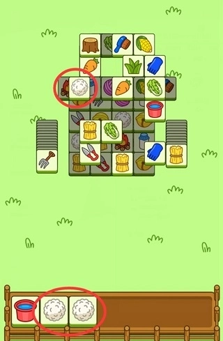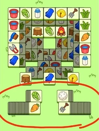 2、当场面上没有能够达成3消的卡牌时,我们可以观察位于下层暂时无法使用的卡牌,在点击上层卡牌后,下方的卡牌便可以使用了(如图中红圈内的白菜),这样我们就能消除一组白菜,但是在使用这个技巧时要避免手中无用卡牌堆积起来最终导致游戏失败。