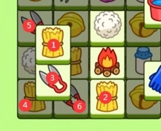 当然我们可以看得再长远一点,如下图这种情况,即便明面上两张卡牌都不够3张,但是我们就能够按照顺序点击直接消除2组卡牌。如果实在没有可以消除的卡牌的话,我们也可以使用位于最下方的3种作弊道具,最终达成通关。