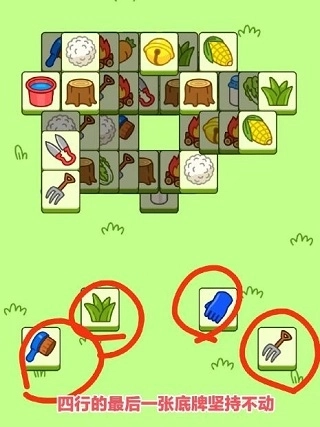 四行的最后一张牌翻出来之后,主要消上面大块的牌而且你最好保证,一个道具都不用,为什么要留下四行的最后一张牌呢?大家都知道道具第-格的用处是抽出三格摆上去,要用的时候就可以直接取用,相当于你原本七格的空间多了三格备用格,而那四行的最后一张牌也一样是备用格。
