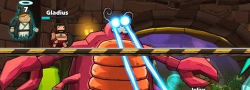 之后选择完人物我们就要开始闯关生涯了。采用虚拟遥杆的操作,左侧是上下左右的控制键子,因为虚拟所以没有显示哦,小编玩着玩着之后发现,虚拟摇杆真的蛮神奇,而且可以用盾牌挡住自己进行下蹲,之后的关卡可离不开这个操作噢,抵挡各种不明飞行物的最好方式就是蹲下。这个A则是攻击键子,B则是跳跃键子。还有大招的释放,当然是有CD的。用这几个按键互相结合的操作打怪物简直不能再舒适了!开始的时候会左右同时出怪物,为了避免掉血,就是要看操作之间的配合情况了。可以跳跃到一方进行攻击,也可以迅速打击左侧之后再攻击右侧,速度是一切的前提。