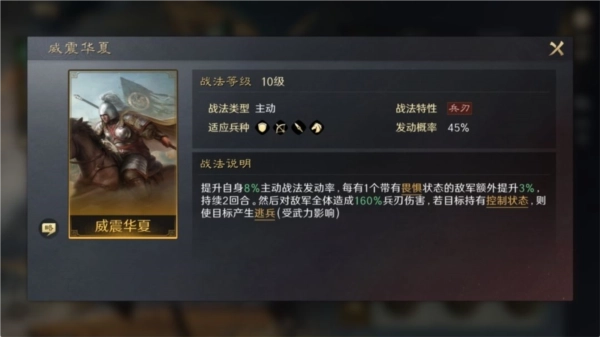 自带战法:【威震华夏】,主动战法,能够提升自身主动战法发动率,并对敌军全体造成伤害。如果敌军有控制效果,还可以发动“逃兵”效果。