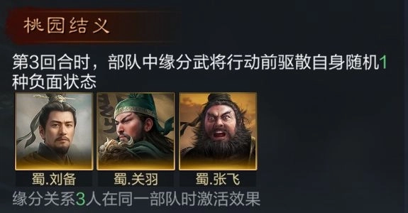 三人可触发桃园结义缘分,第三回合行动前驱散自身随机一种负面状态。刘备依靠自身战法再佩戴【青囊急救】可以保证部队续航能力,减少受到负面效果的影响,再依靠张飞先手施加“畏惧”状态,提高关羽主动战法发动率,使关羽能够更加稳定输出。