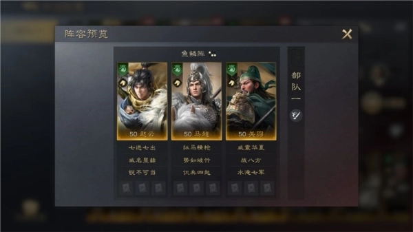 属于一组快速解决战斗类型的部队,每个武将都有造成群体伤害和高频攻击的战法,关羽施加敌军全体“畏惧”状态,使敌军统率降低,马超依靠负面效果造成额外伤害,携带【势如破竹】增加会心几率,使【纵马横枪】追伤次数提高。