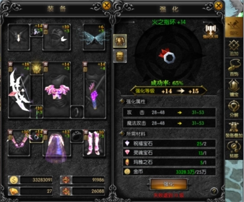 在天使之战游戏里首饰的强化追加和武器防具相同,拥有同一套判定机制。需要注意的是,首饰类型的不同将会造成强化属性的不同,耳环为防御类型,强化得到防御加成;项链、指环为攻击类型,强化得到攻击加成。