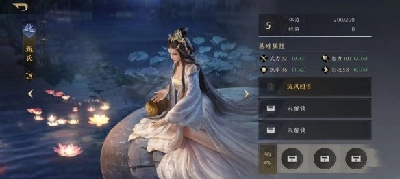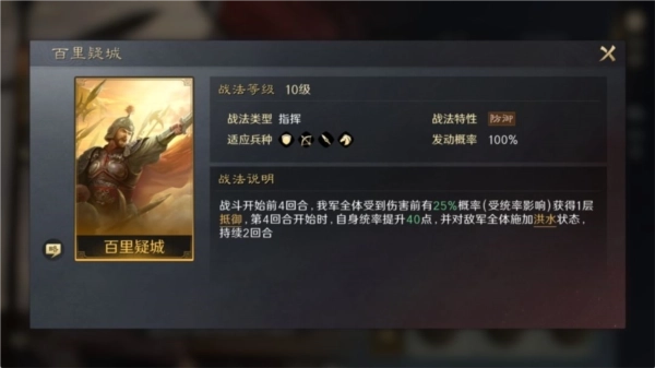 自带战法:【百里疑城】,指挥战法,战斗开始前四回合,让我军全体受到伤害前有概率获得一层“抵御”,第四回合,提高自身统率值,并对敌军全体施加“洪水”状态。