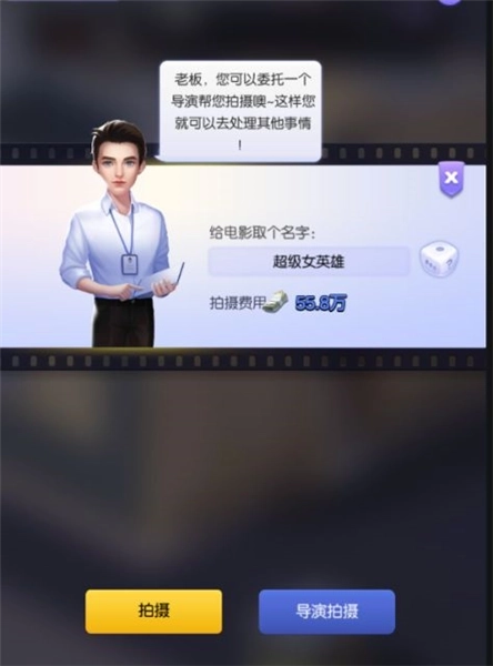 然后选择「拍摄」/「导演拍摄」,建议是选择「导演拍摄」,因为我们这部电影是「科幻片」我们就选择「科幻片」导演协助拍摄,这样还能提升该导演的经验值。