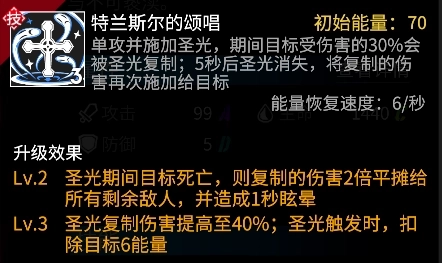 战斗开始时,蓝莎会单攻当前目标,并施加持续伤害至其死亡。该被动分为两部分:其中开场单攻可进一步强化蓝莎在开局的伤害爆发;而后续追加的持续伤害则不仅保证蓝莎的稳定输出,同时可进一步放大大招圣光伤害。被动升级后,如果首个目标死亡,效果会转移下个目标;结合蓝莎易于秒人的特征,可保证持续伤害效果不会中断。