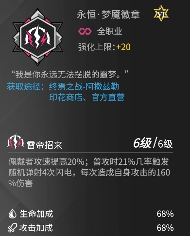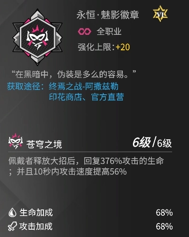 如前所述,洛瑞丝主要以堆叠攻击、暴击、暴击伤害属性为主,追求极限的输出能力,或选择奥义套装定向强化大招威力,提高连续收割的可能性;除此之外,也可选择效果命中或攻速属性提高被动触发的频率。徽章方面,梦魇徽章和魅影徽章都提供了洛瑞丝所需的攻速属性,能有效提高洛瑞丝被动触发频率,最为适配。