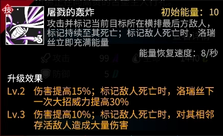 洛瑞丝会选择当前目标最后方的敌人进行攻击,跟山崎相同,绕过前排坦克直接攻击后方脆皮。洛瑞丝大招命中敌人后会施加标记,其死亡时会立即给洛瑞丝充满能量;极限情况下可从后往前连续收割一整个横排的敌人。大招升级后,标记目标死亡后会爆发群攻伤害,同时提高洛瑞丝下次大招的伤害,让连续收割变得更加容易触发。因为洛瑞丝的大招连续触发需要依赖尽快击杀后排,可搭配山崎或者卡缪来加快收割后排的节奏。