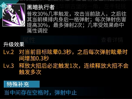 洛瑞丝在普攻的时候有几率触发连续弹射效果,在当前横排内从前往后依次弹射,且每次弹射都会提高下次弹射造成的伤害。该效果进一步提高了洛瑞丝对后排敌人的伤害,便于更快击杀,触发大招充能。被动升级后弹射还额外附加眩晕效果,且在大招释放后可稳定触发一次。跟伤害相同,眩晕时间也会随弹射次数提高,利用好该眩晕可有效限制敌方远程职业的输出。值得注意的是,弹射距离仅限一格,如果当前横排内的两个敌人中间有空格则弹射会提前中止。