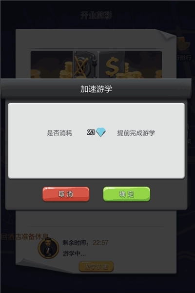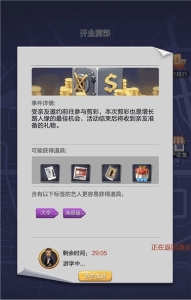 参与灰色任务需要消耗5张游学手册去进修,这类任务通常包含两个艺人标签,符合标签要求的艺人去游学,带回道具的概率会更高。每个游学地点都配有详细的文字说明,像图里的开业剪彩事件,描述得十分逼真,连小编都差点信以为真了。灰色游学点完成一次游学要30分钟,能带回的道具数量不多,而且大多是影都风景照、巨星信息册、破碎的场记板这类低级道具。要是想加快游学进度,可以用钻石加速,消耗的钻石数量和剩余时间成正比,每分钟需要消耗1颗钻石。