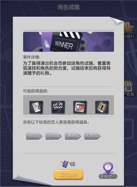 蓝色任务需要消耗10张游学手册才能前往进修,这类任务通常包含四个艺人标签,使用符合标签要求的艺人参与游学,带回道具的概率会更高。要是玩家对当前地点不满意,或者想刷新出等级更高的游学地点,可以花费50钻石更换游学地点。(此操作不建议进行)