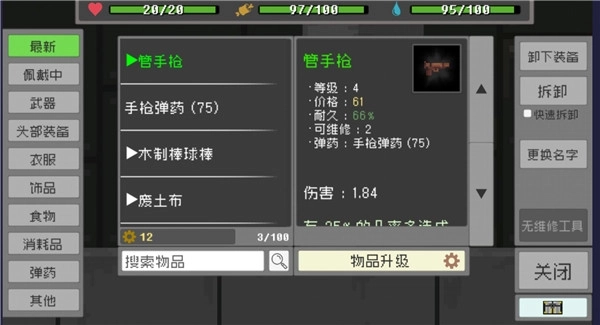 3、选择武器一栏将赠送的枪支装备,可以同时装备多种武器,还可以使用各种消耗品、食物等
