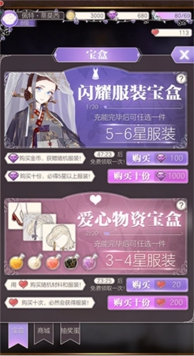 1、玩家在商场中可通过钻石购买一些搭配及首饰,闪耀服装宝盒及爱心物资宝盒都可进行免费购买,等待冷却时间即可。两种宝盒各自在购买三十次后都可获得一件任选3-6星服装。同时在舞会中,打扮符合人们的喜好所获得的爱心也可用于在爱心物资宝盒中进行抽奖。