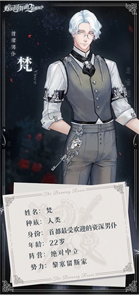 来自奥斯兰的梵现在是黎塞留斯家的首席男仆。小到女士的鞋扣掉了该如何处理,大到女王寿辰宴席该如何操办,他样样精通。有他在的舞会,你不需要担心任何事,只管享受就行了,而他永远笑脸迎人,永远准备好为你服务。