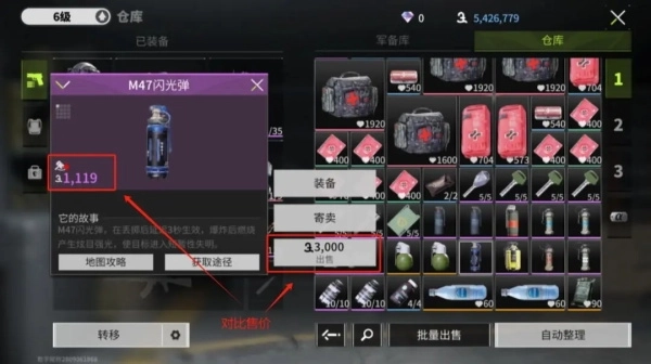 首先,教萌新如何快速查看一个物品的价值,在仓库里选中物品左侧标注的新币就是寄卖市场价值,下方出售就是卖给系统的价值,这样大家就知道卖的时候去哪个市场更加划算了。比如这个m47闪光弹,你自己出售能卖3000,上寄卖市场就只能卖1119,还不如自己卖···当然也有人去寄卖市场买回来卖给系统,但是赚不了多少新镑就是了,不建议大家费这个劲。(商品价格以游戏内实时价格为准,价格是波动的)