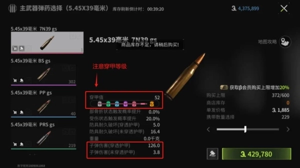子弹有1~6级不同等级,分别可以穿透对应等级的护甲,如下图所示,5级子弹可以穿透5级护甲。造成126穿透伤害,如果未穿透,就只能造成3.8伤害。进入局内游戏,四级子弹几乎是必须的,因为大多数人都是身穿3级以上的护具,如果带低级子弹进入地图就只能刮痧,因此子弹的消耗需求是非常大的。
