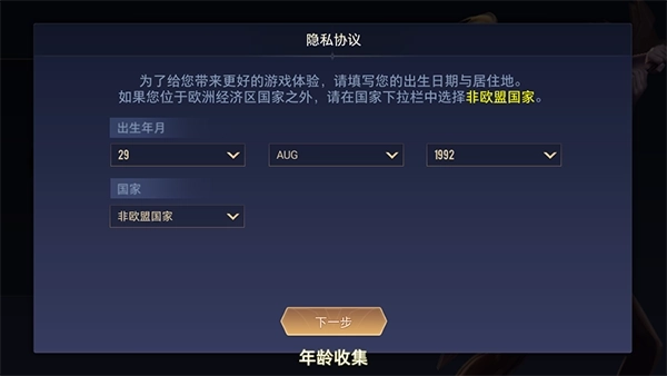 4、登录账号或以游客身份进入游戏后,我们需要先填写国家/地区和年龄信息。请注意:年龄不得过小。