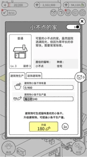 4、建筑升级:建筑能够产出猫咪喜爱的小鱼干,这些小鱼干可以用于建筑的升级操作。